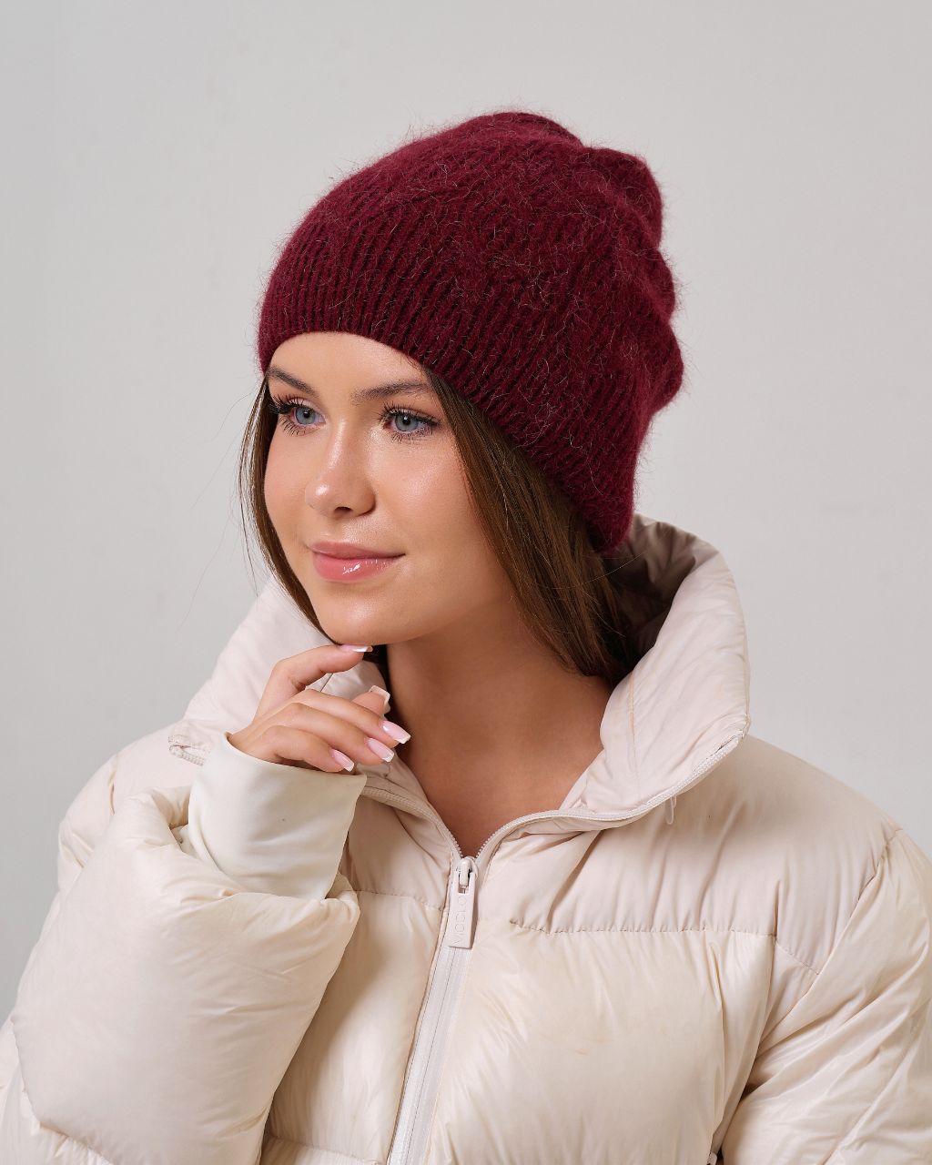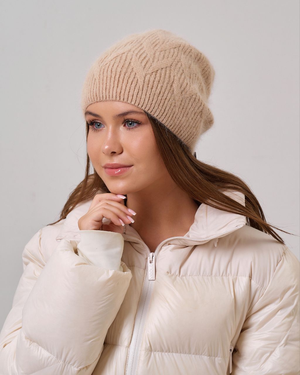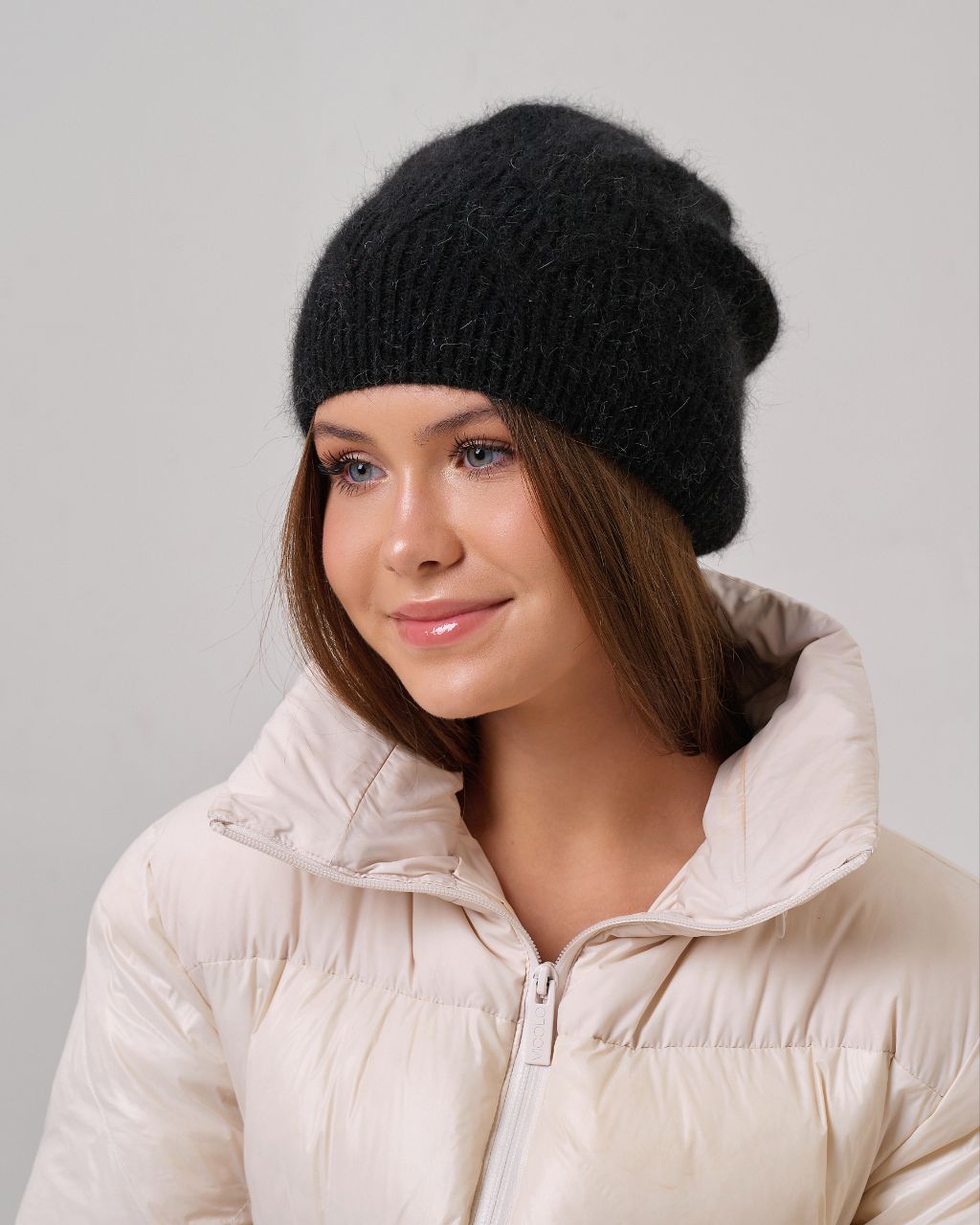 Жіноча шапка з ангори та нейлону. Надзвичайно м’яка й тепла, легка та комфортна у щоденному носінні. Завдяки еластичній структурі добре тримає форму й гармонійно поєднується як із повсякденними, так і з класичними образами.