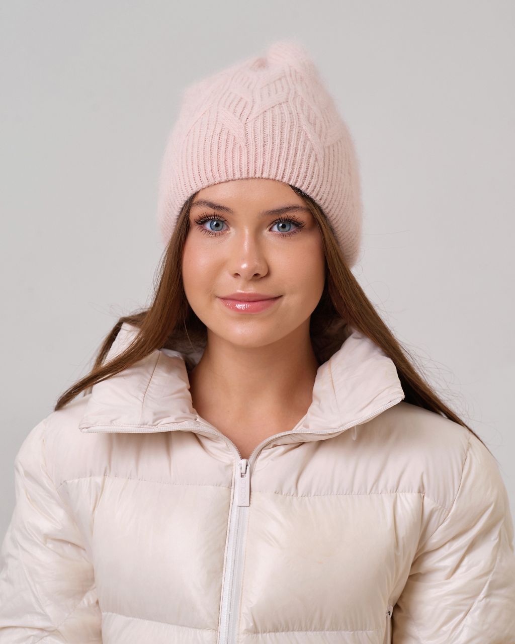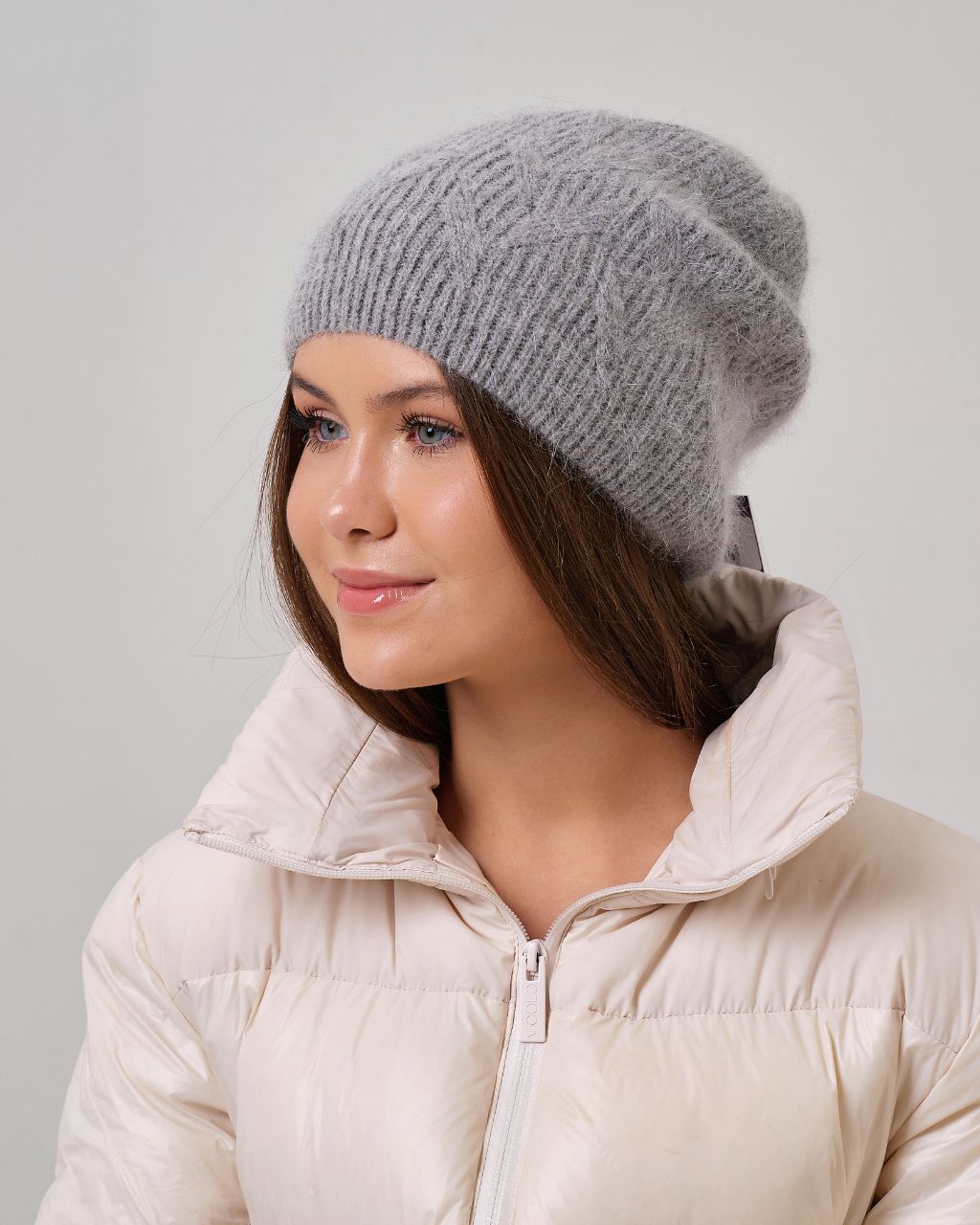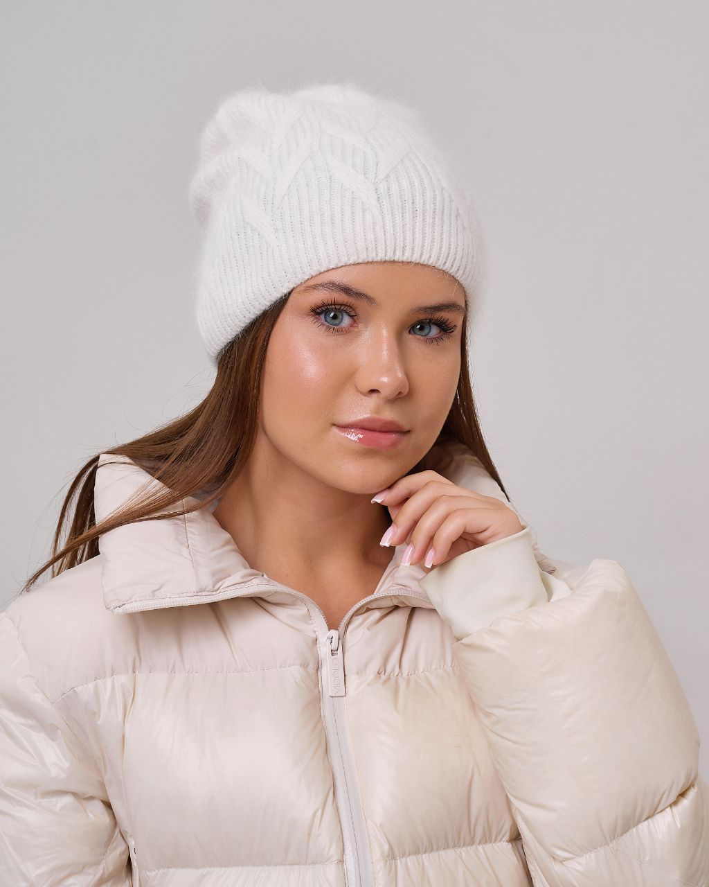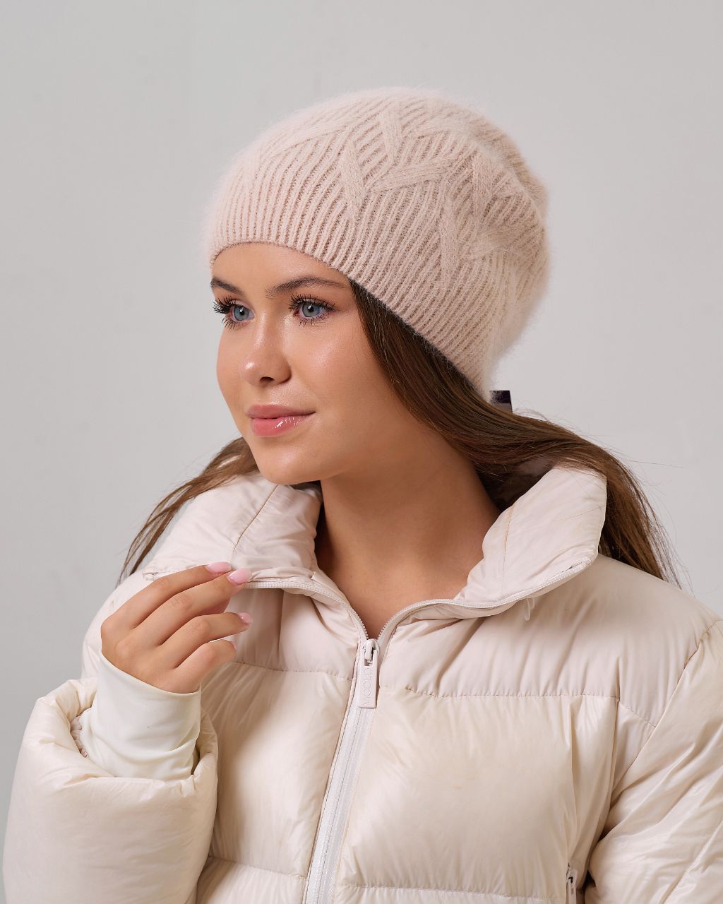 Жіноча шапка з ангори та нейлону. Надзвичайно м’яка й тепла, легка та комфортна у щоденному носінні. Завдяки еластичній структурі добре тримає форму й гармонійно поєднується як із повсякденними, так і з класичними образами.