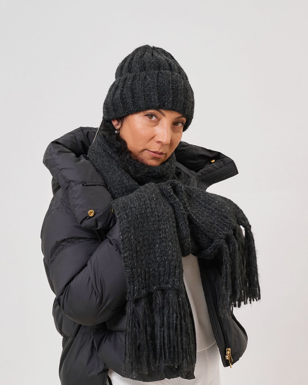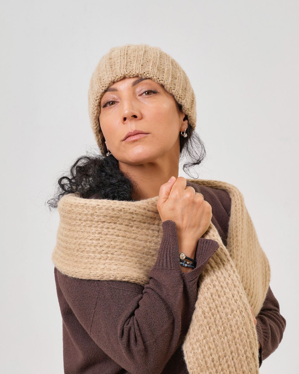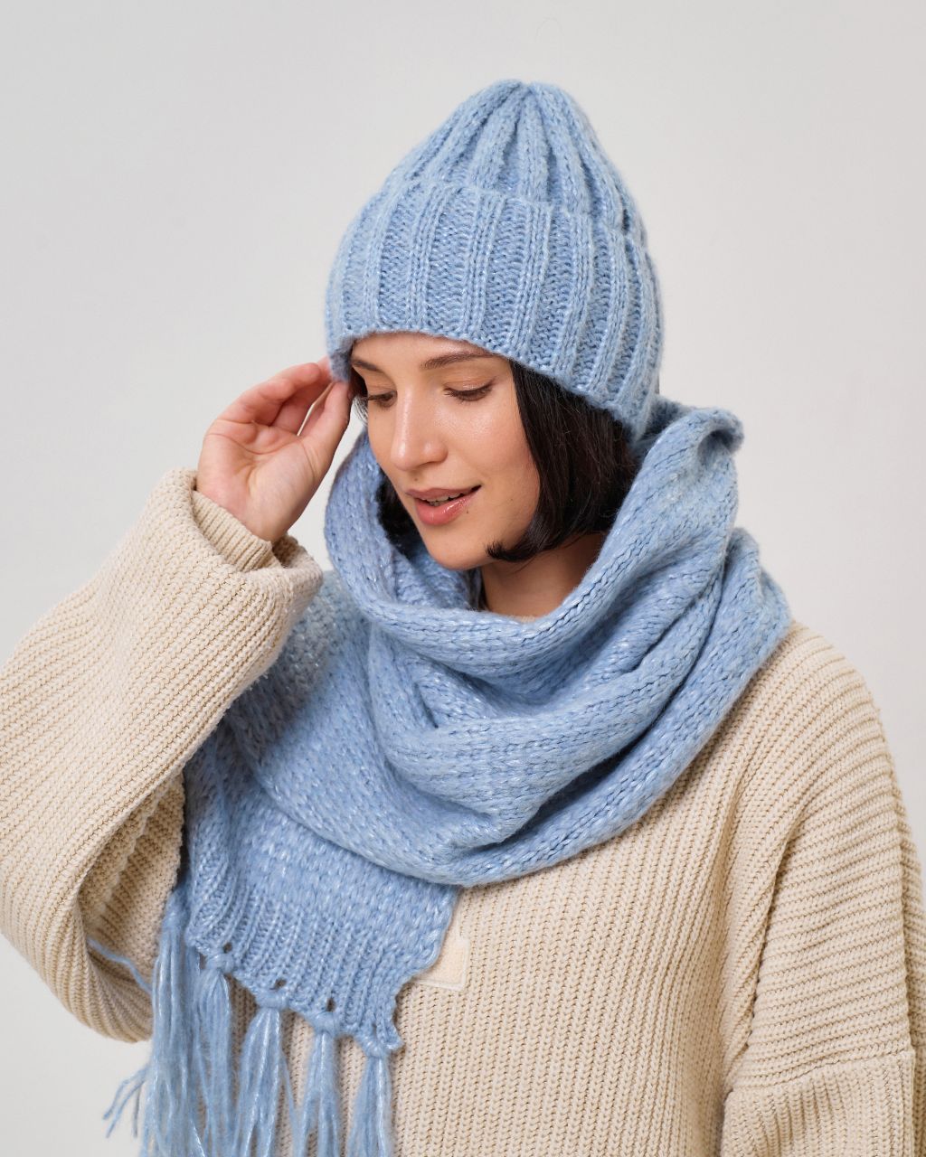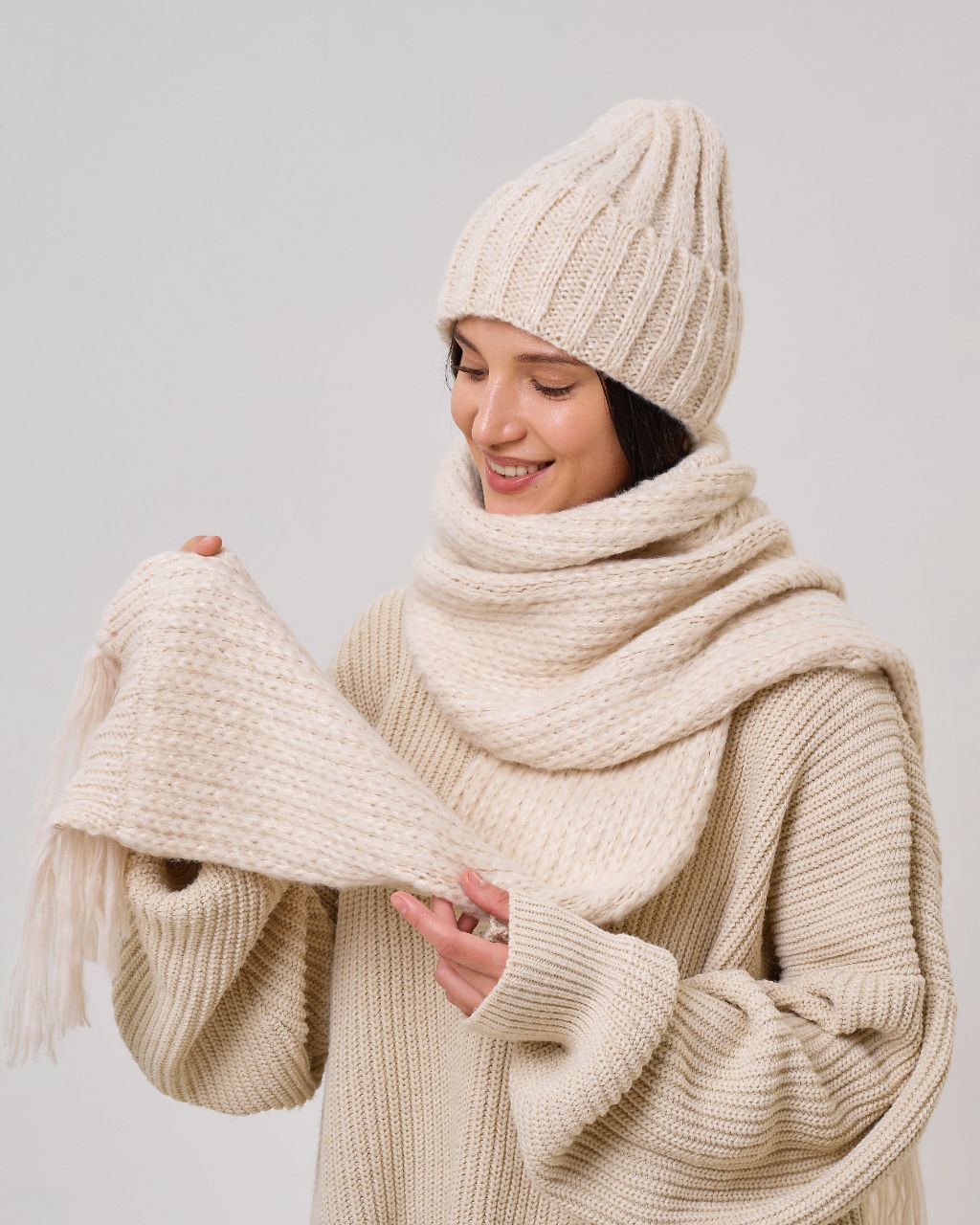 Жіночий комплект із мериносовою вовною та мохером (шапка та шарф у тон). Теплий, м’який і вишуканий, створює відчуття затишку та елегантності. Завдяки унікальному складу поєднує ніжність і довговічність, підходить для тих, хто цінує комфорт і стиль.