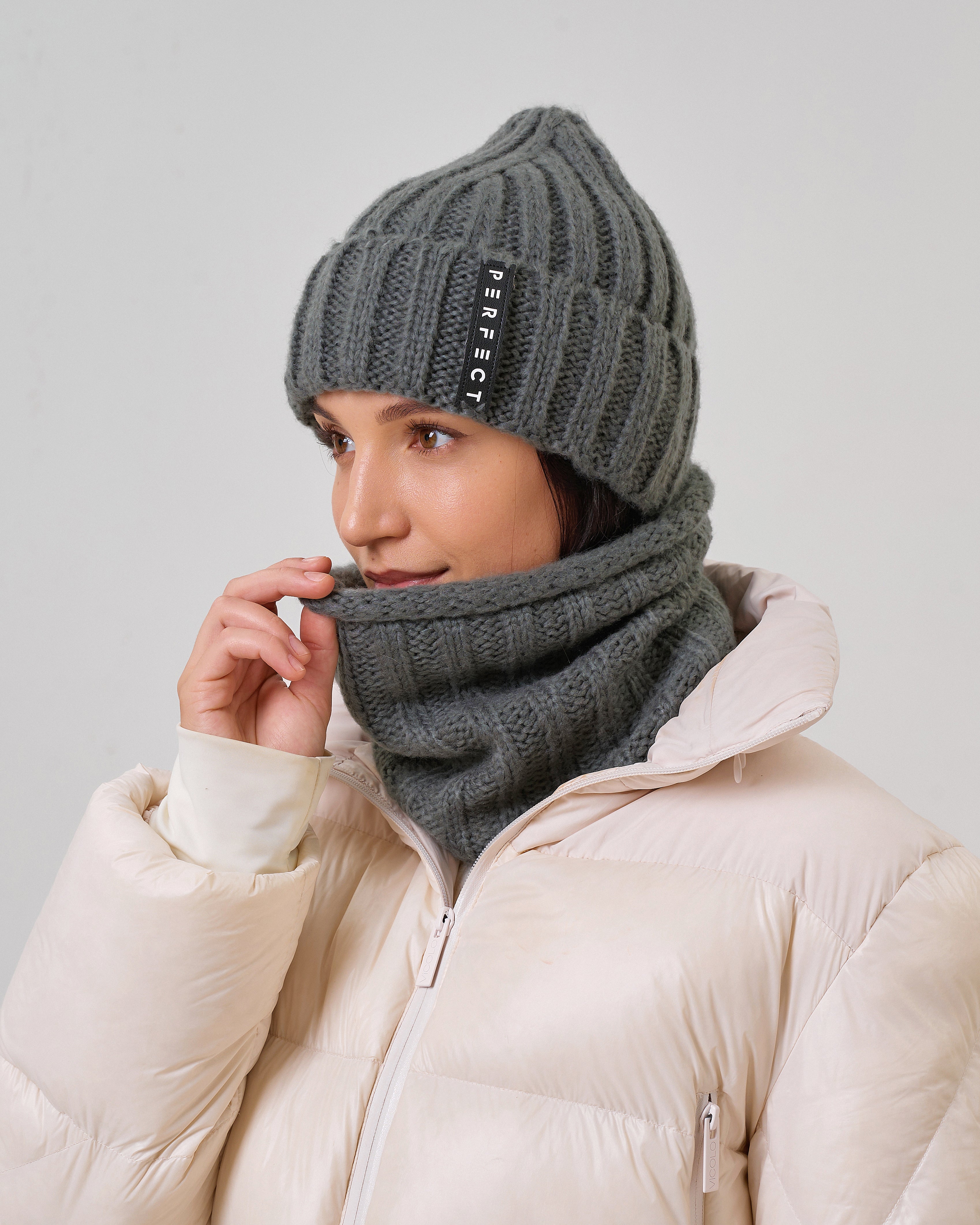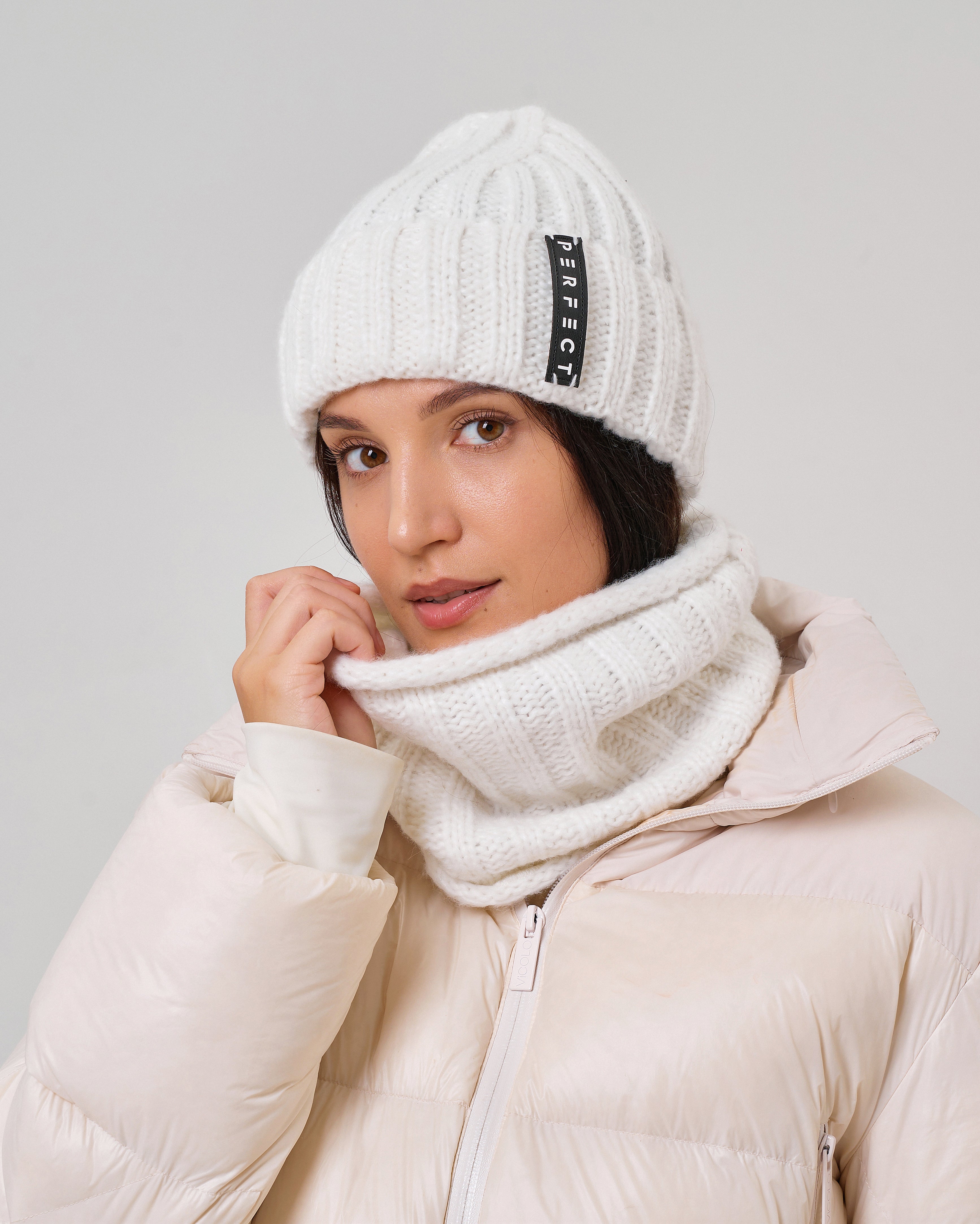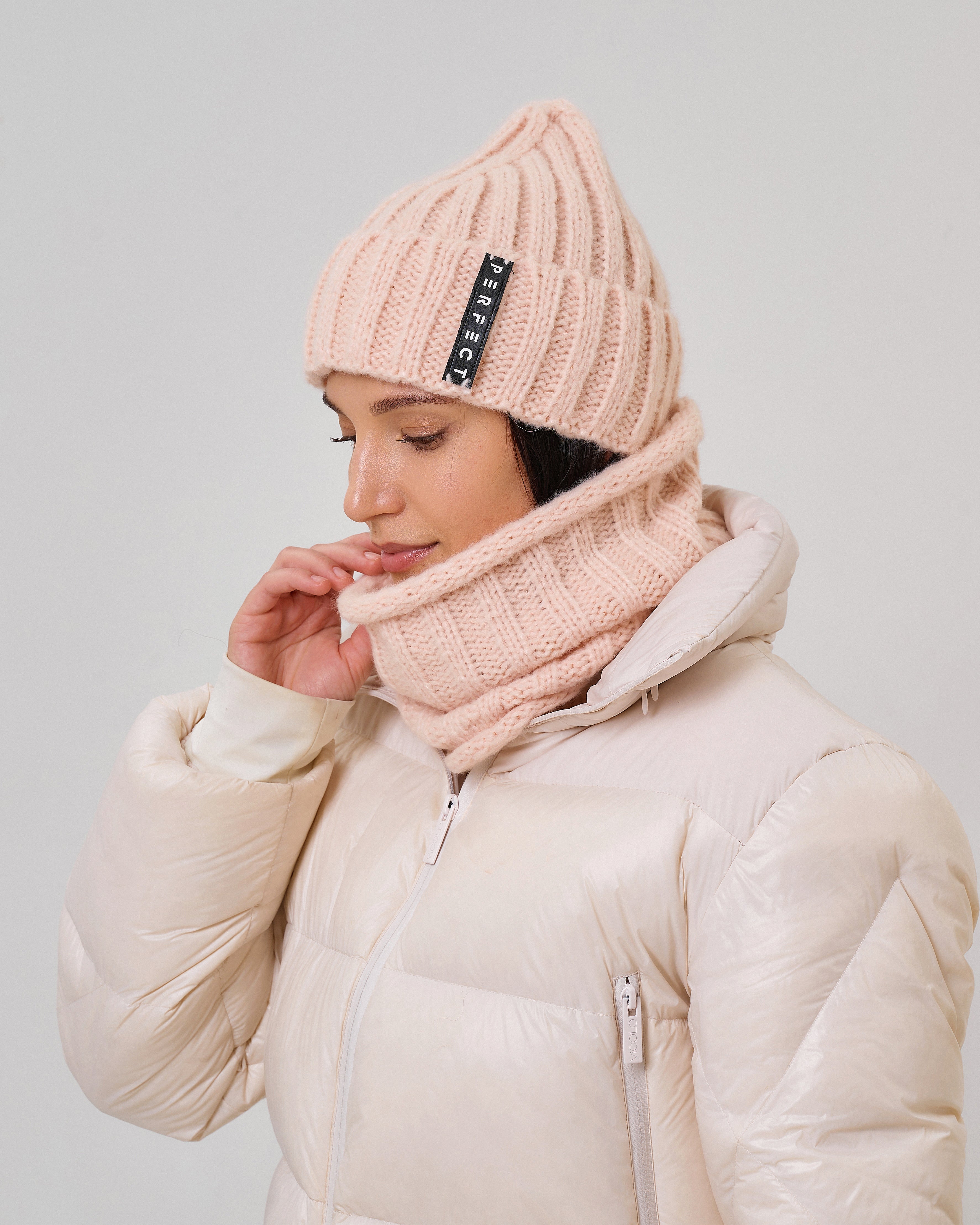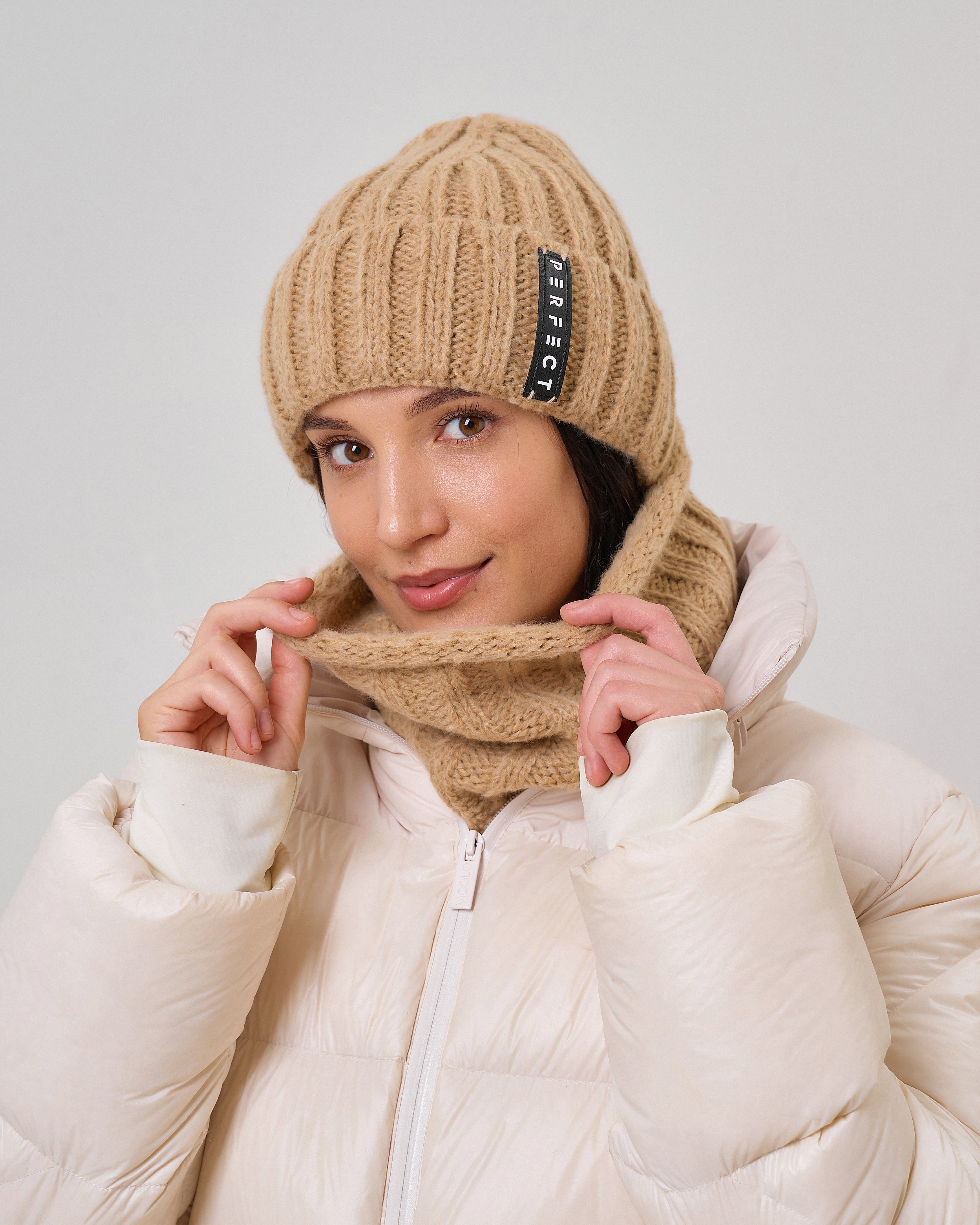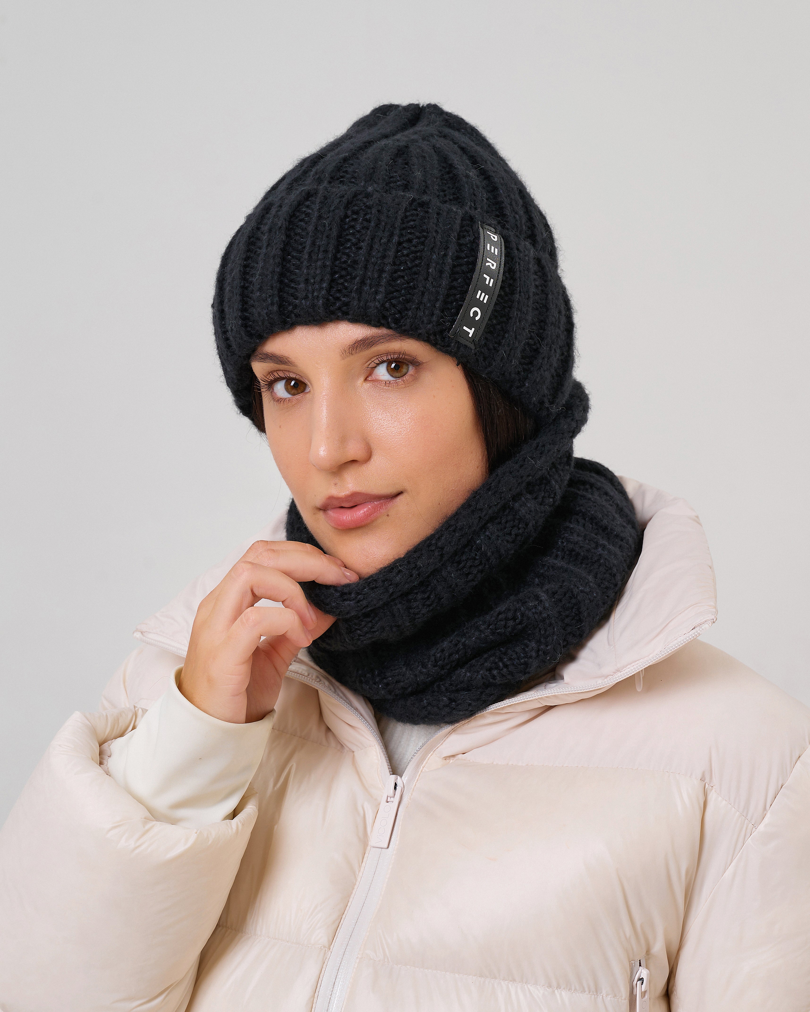 Жіночий комплект із мериносовою вовною (шапка та шарф у тон). М’який і теплий, приємний на дотик та комфортний у щоденному носінні. Лаконічний дизайн робить цей сет універсальним вибором як для повсякденного стилю, так і для класичного верхнього одягу.
