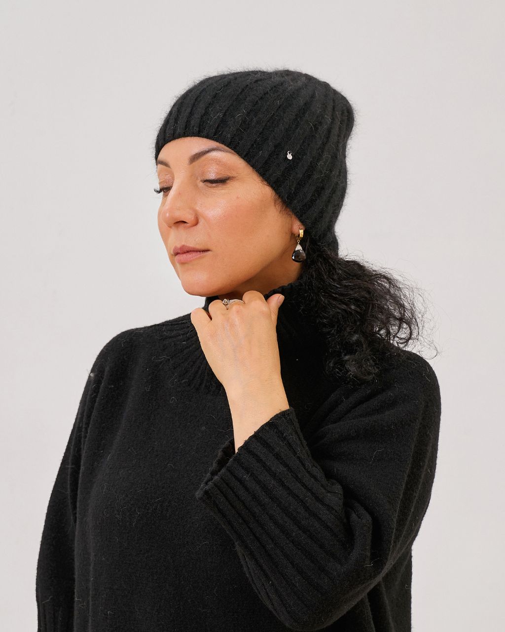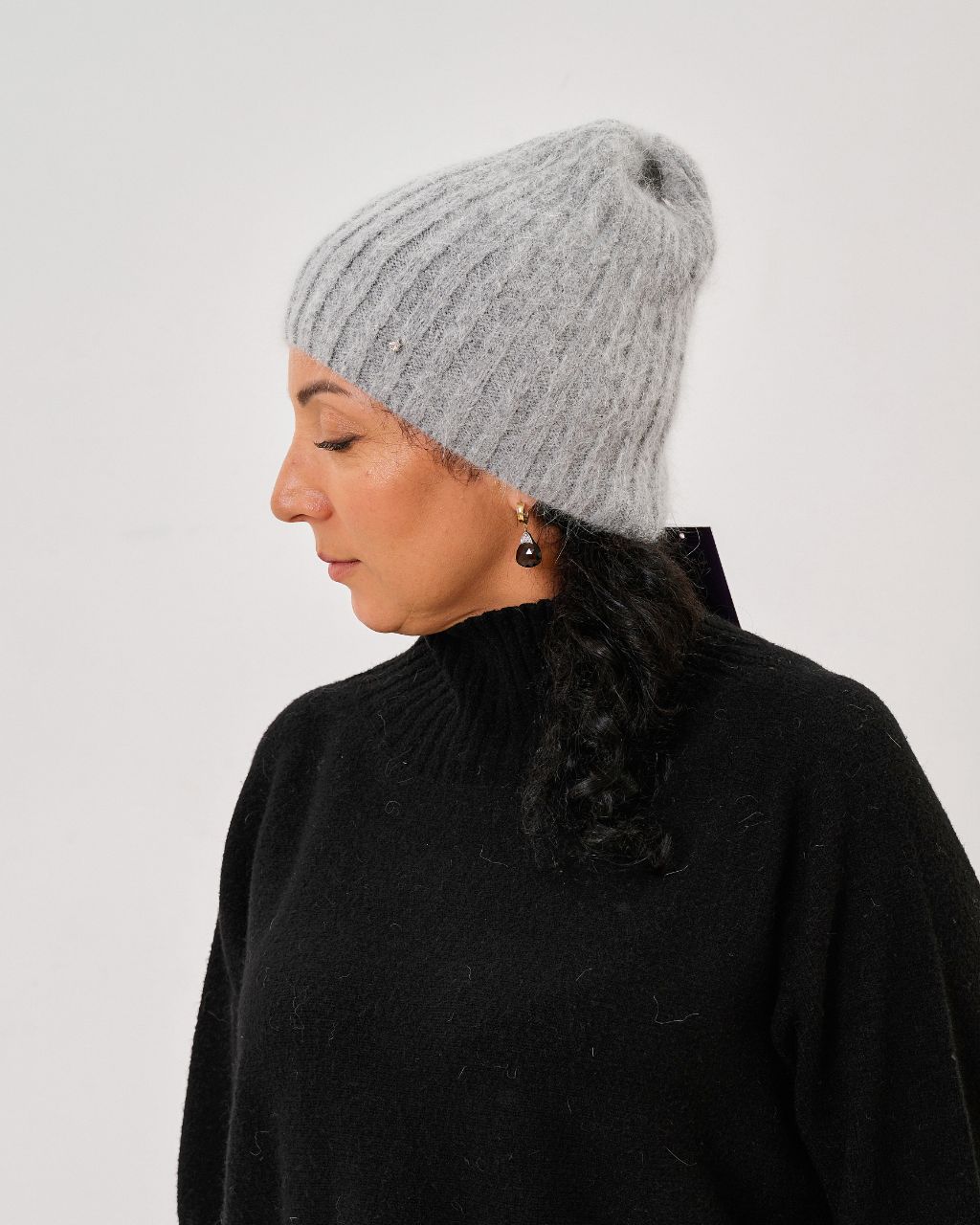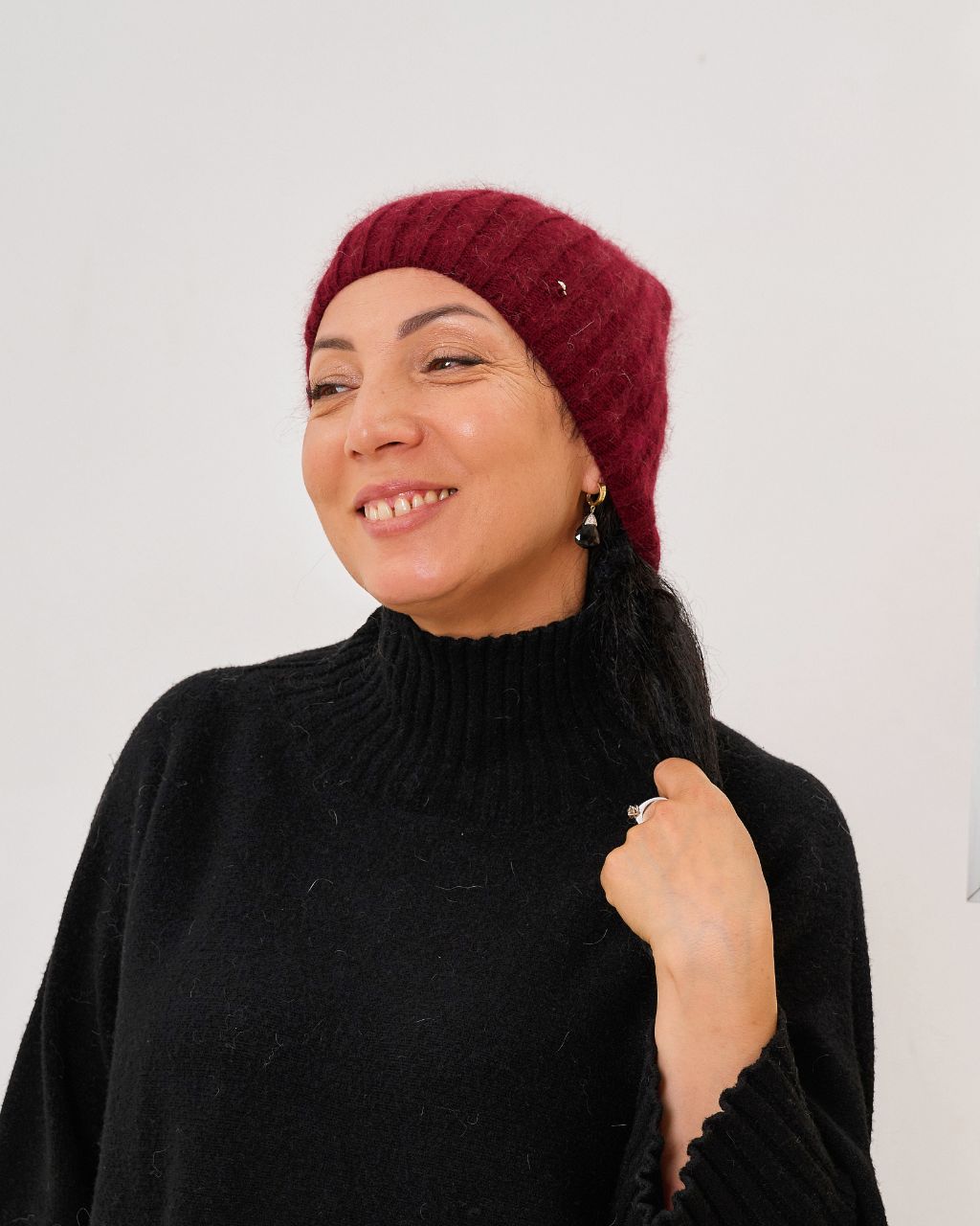 Жіноча шапка з ангори та нейлону. Дуже м’яка й тепла, легка за вагою та комфортна у носінні. Завдяки еластичній структурі добре тримає форму та гармонійно поєднується як із повсякденними луками, так і з класичним верхнім одягом.
