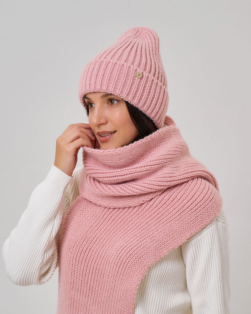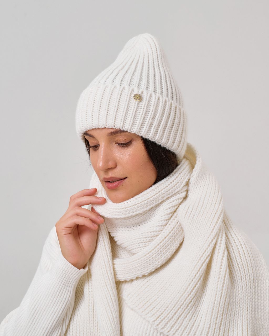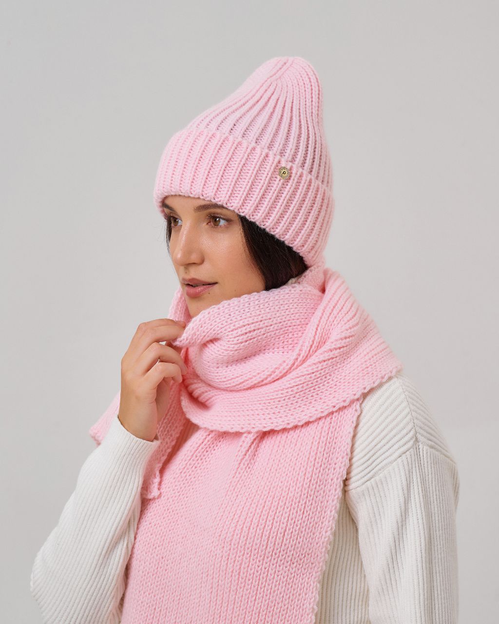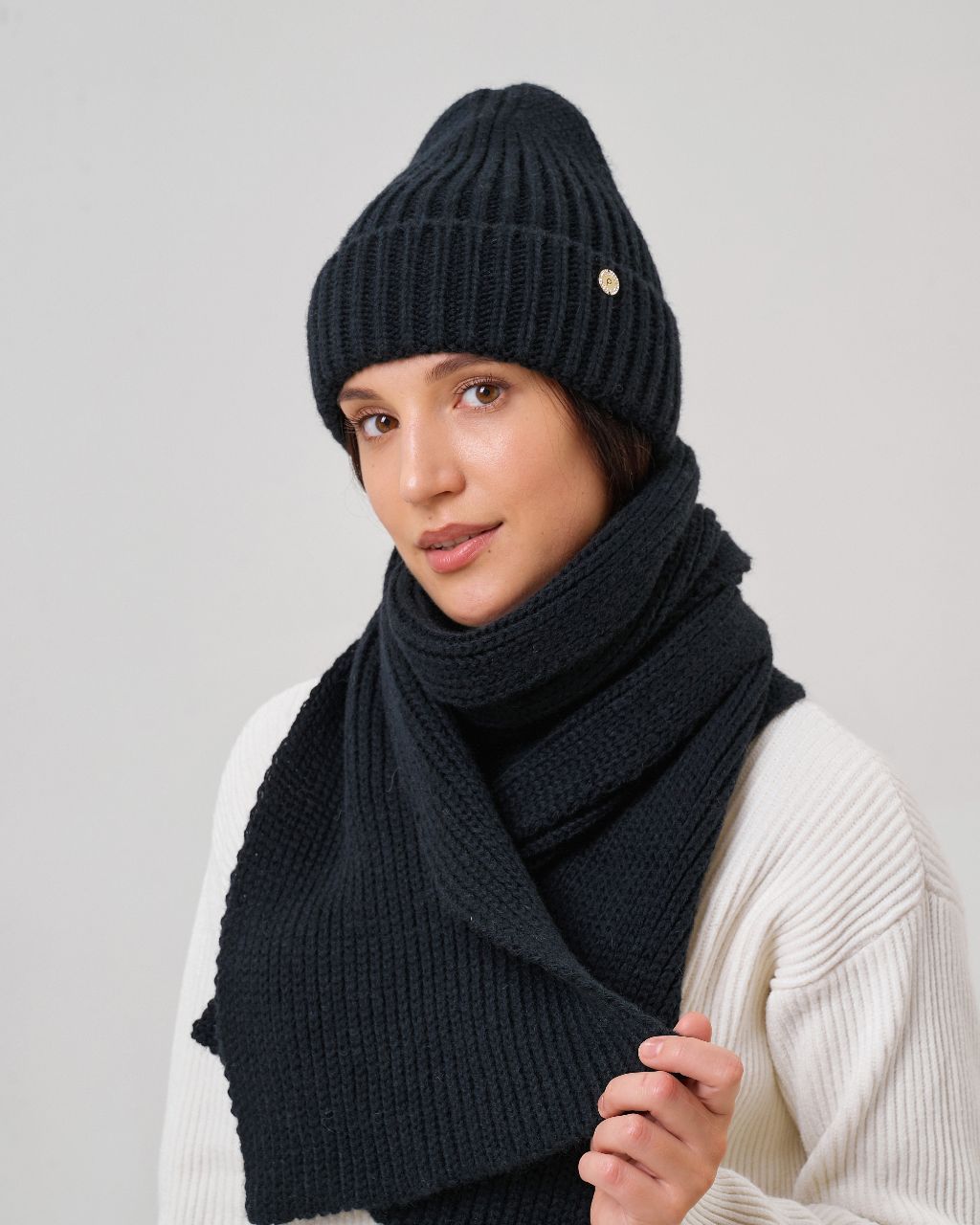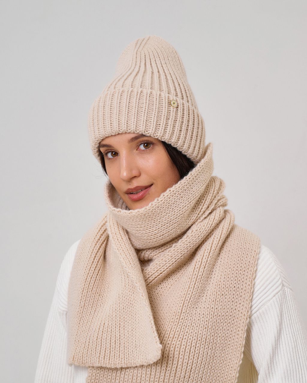 Жіночий комплект із вовни та акрилу (шапка та шарф у тон). Теплий, м’який і комфортний у щоденному носінні. Завдяки універсальному дизайну пасує як до повсякденних образів, так і до класичного стилю, створюючи завершений сет на прохолодний сезон.