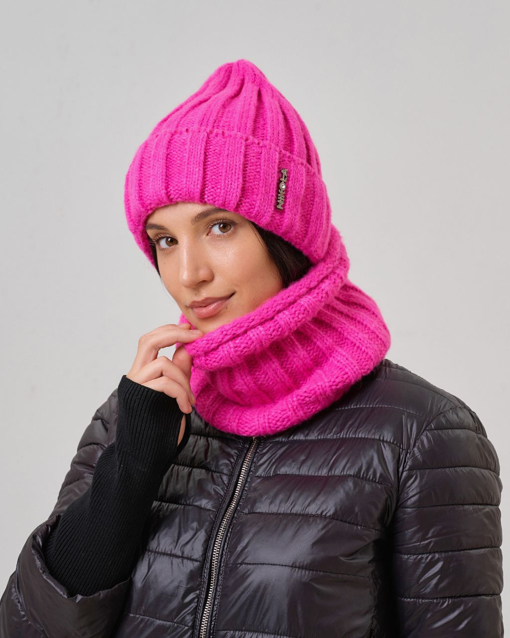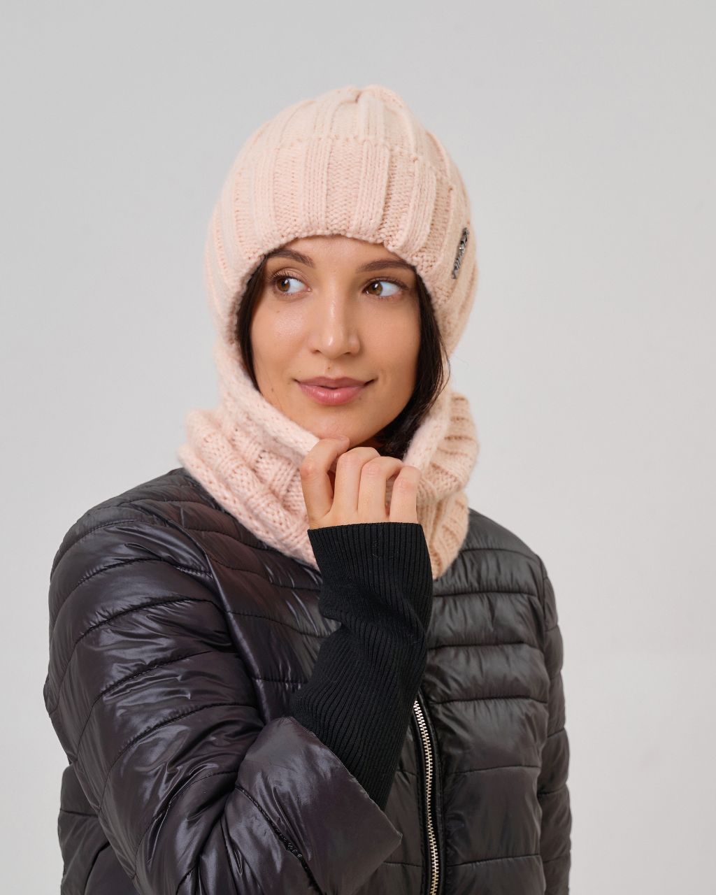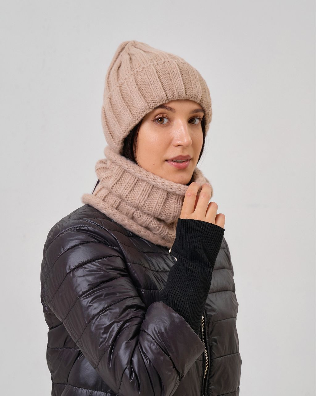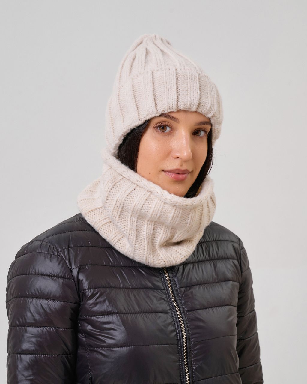 Жіночий комплект із мериносовою вовною (шапка та шарф у тон). Теплий, м’який і приємний до тіла, забезпечує комфорт і захист від прохолоди. Завдяки мінімалістичному дизайну легко пасує як до повсякденного одягу, так і до класичних образів.