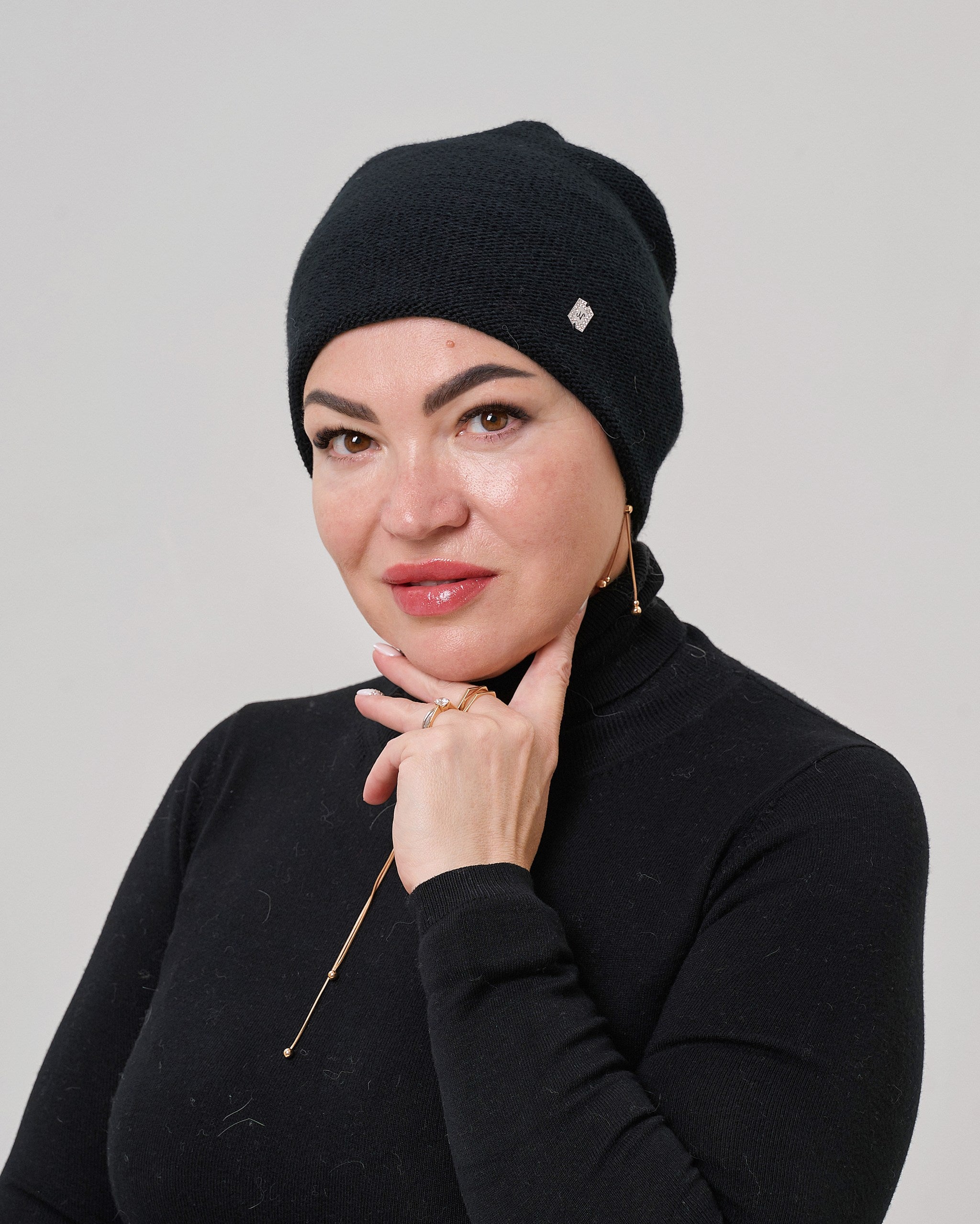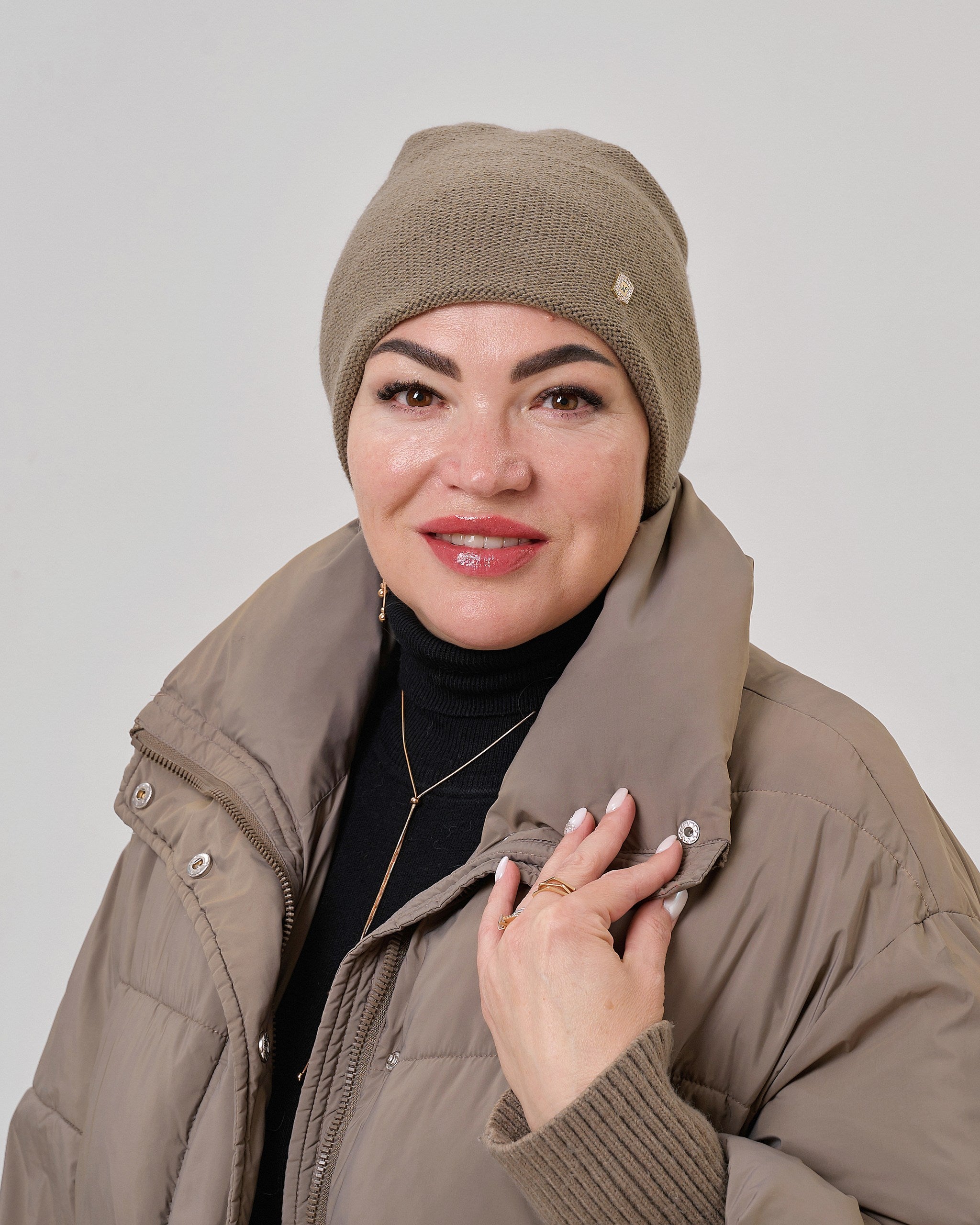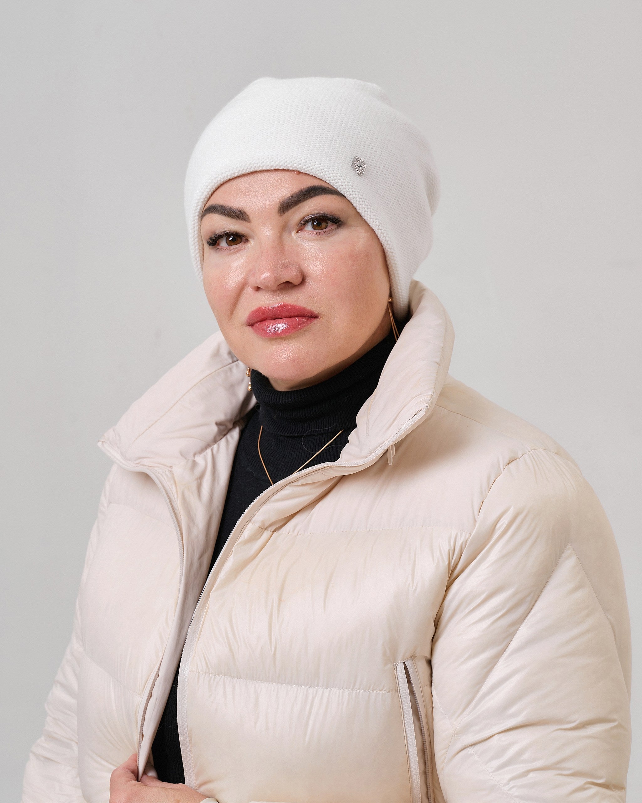 Жіноча шапка з вовни, акрилу та мериносової шерсті. Вона тепла, м’яка та комфортна у носінні, дарує відчуття затишку й підкреслює індивідуальний стиль. Завдяки мінімалістичному дизайну модель легко поєднується з різними луками — від повсякденних до класичних.