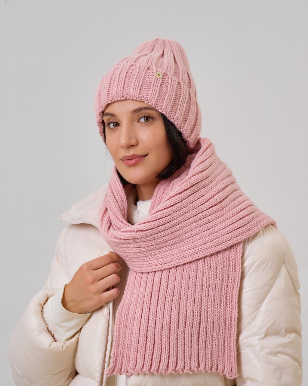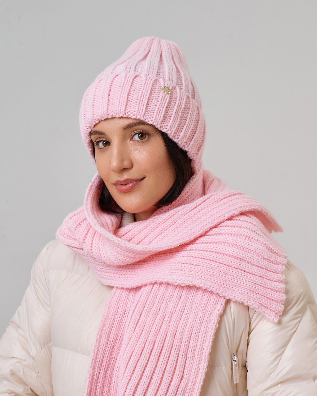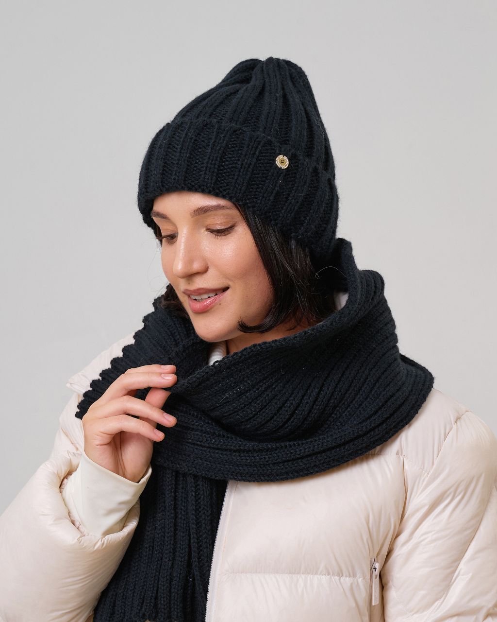 Жіночий комплект із вовни та акрилу (шапка та шарф у тон). Теплий, м’який і комфортний у щоденному носінні. Лаконічний дизайн робить цей сет універсальним вибором, який пасує як для повсякденних луків, так і для класичних образів.